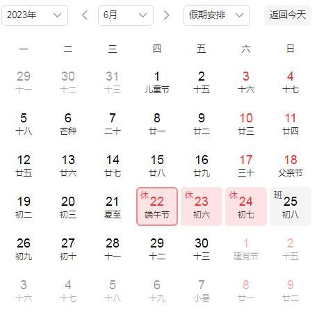 值得關(guān)注的是,五一之后下一個節(jié)假日就是端午節(jié),網(wǎng)友發(fā)現(xiàn),端午節(jié)和五一同樣需要調(diào)休:今年端午節(jié)是6月22日,22日-24日放假,25日(周日)上班。也就是說,法定放假一天,但打亂了正常雙休,25日(周日)調(diào)休一天,假期后再連續(xù)上班6天。