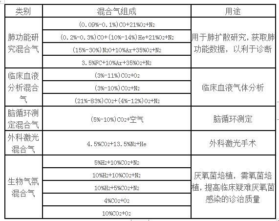 臨床醫(yī)學(xué)、衛(wèi)生防疫、醫(yī)療和生物研究等領(lǐng)域需用的混合氣體,主要品種有:肺功能研究混合氣、臨床血液氣體分析用混合氣、腦循環(huán)測定混合氣、外科激光混合氣、生物氣氛混合氣以及組織當(dāng)量混合氣等。